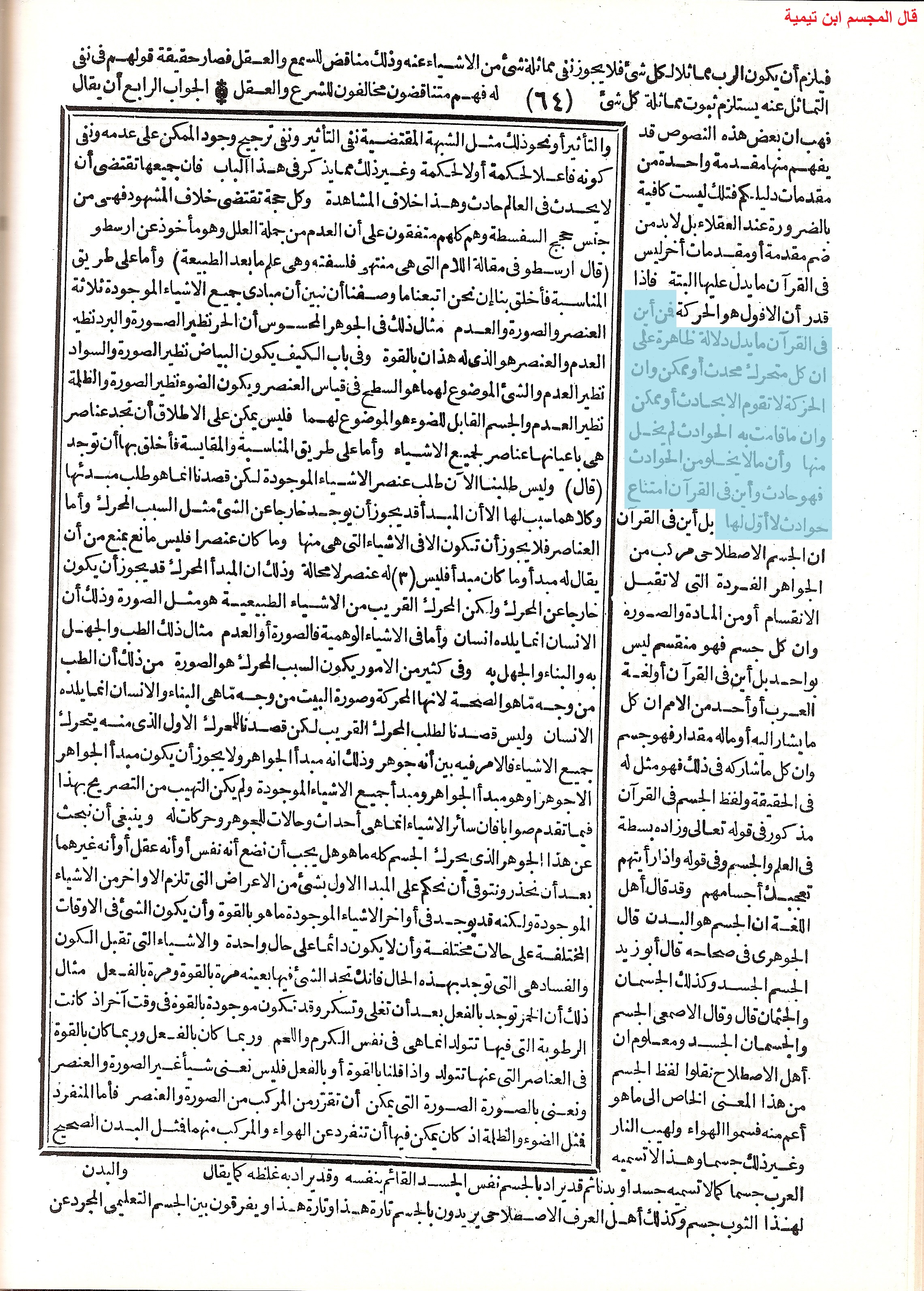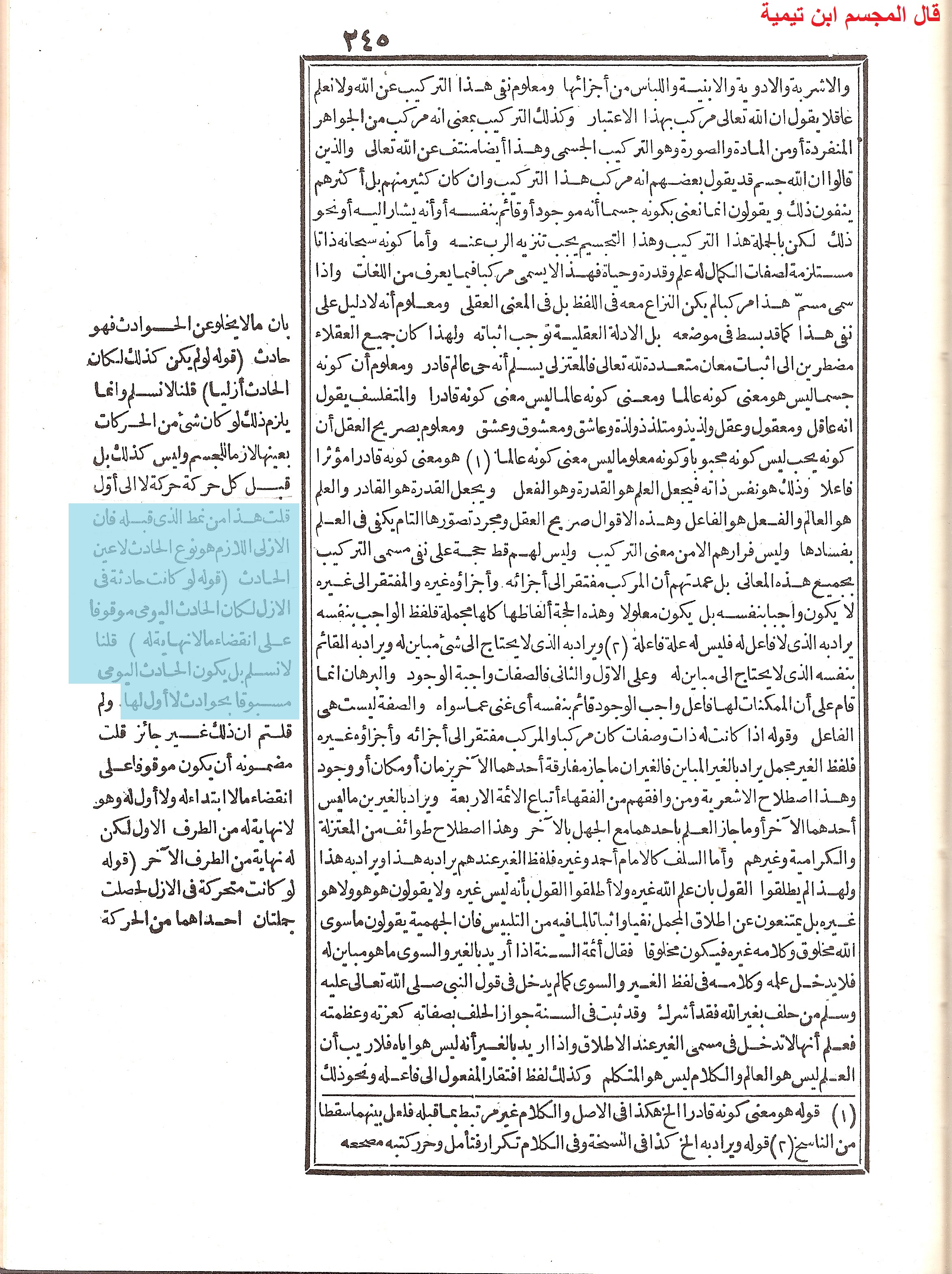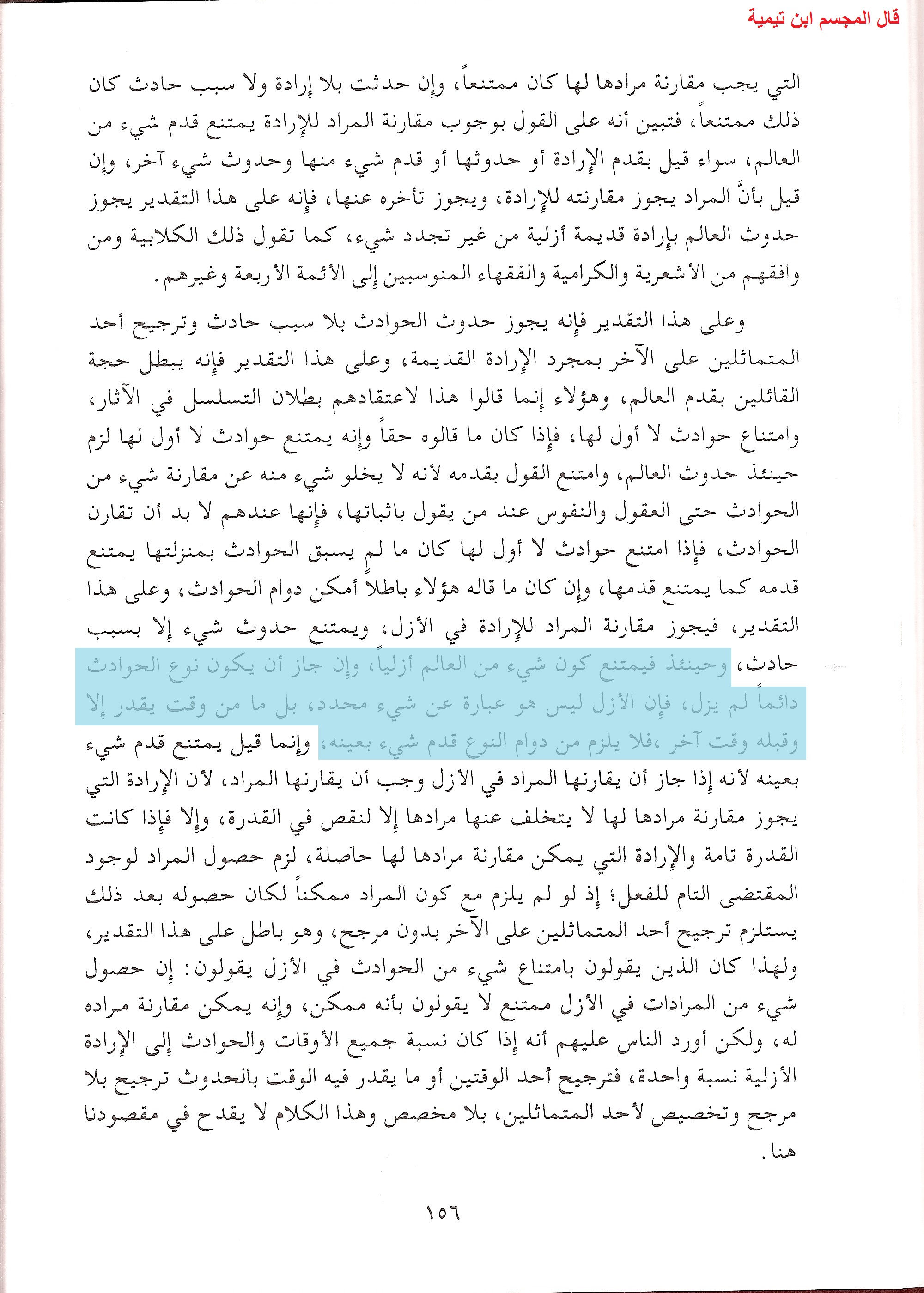 ويقول فيها أيضا ما نصه : ”فمن أين في القرءان ما يدل دلالة ظاهرة على أن كل متحرك محدث أو ممكن، وأن الحركة لا تقوم إلا بحادث أو ممكن، وأن ما قامت به الحوادث لم يخل منها، وأن ما لا يخلو من الحوادث فهو حادث، وأين في القرءان امتناع حوادث لا أول لها » ا.هـ. فهذا من عجائب ابن تيمية الدالّة على سخافة عقله قوله بقدم العالم القدم النوعي معحدوث كل فرد معين من أفراد العالم