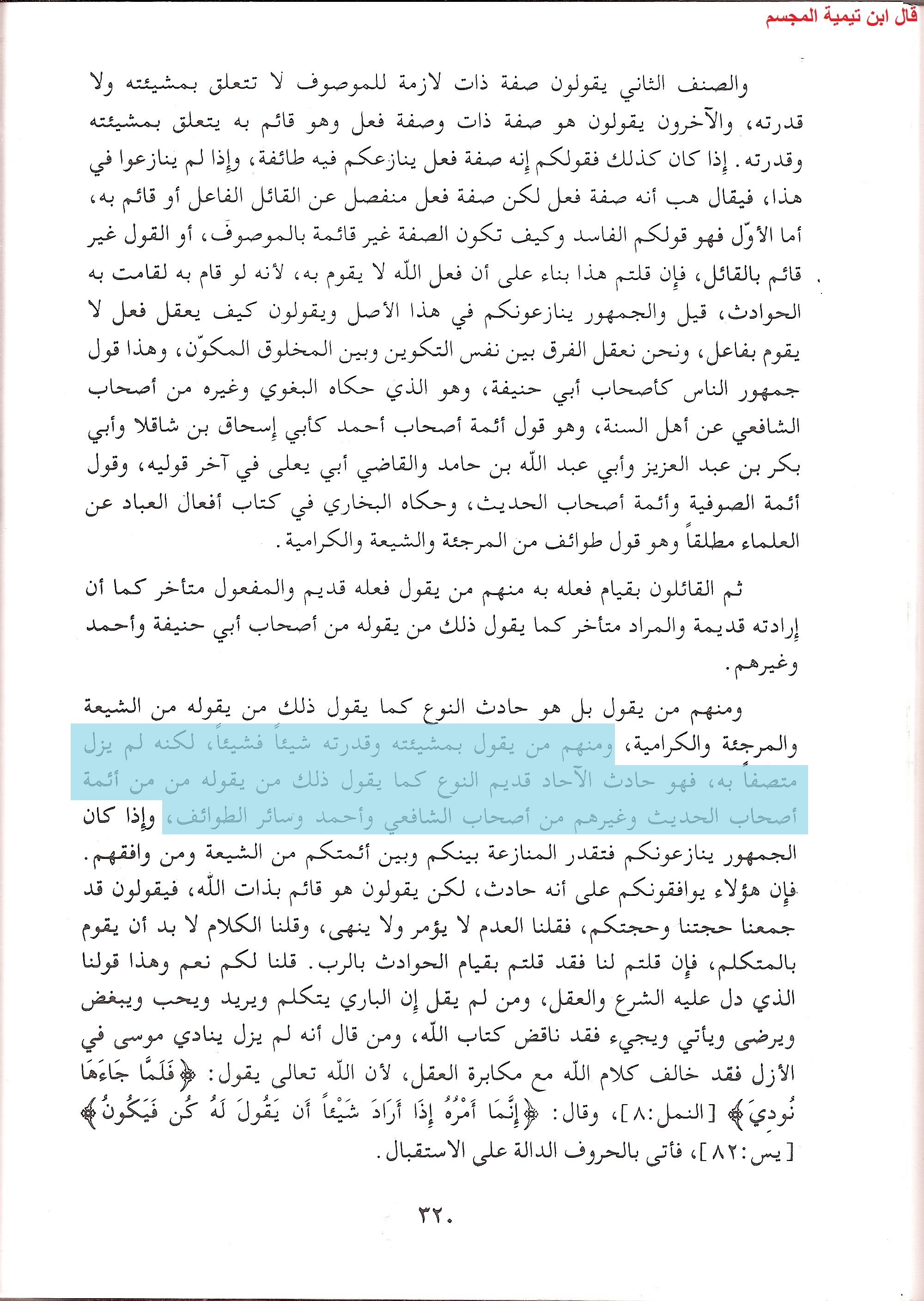 وقال- أي ابن تيمية – في منهاج السنّة النبوية ما نصه : « فإن قلتم لنا: فقد قلتم بقيام الحوادث بالربّ، قلنا لكـم: نعم، وهذا قولنا الذي دلّ عليه الشرع والعقل