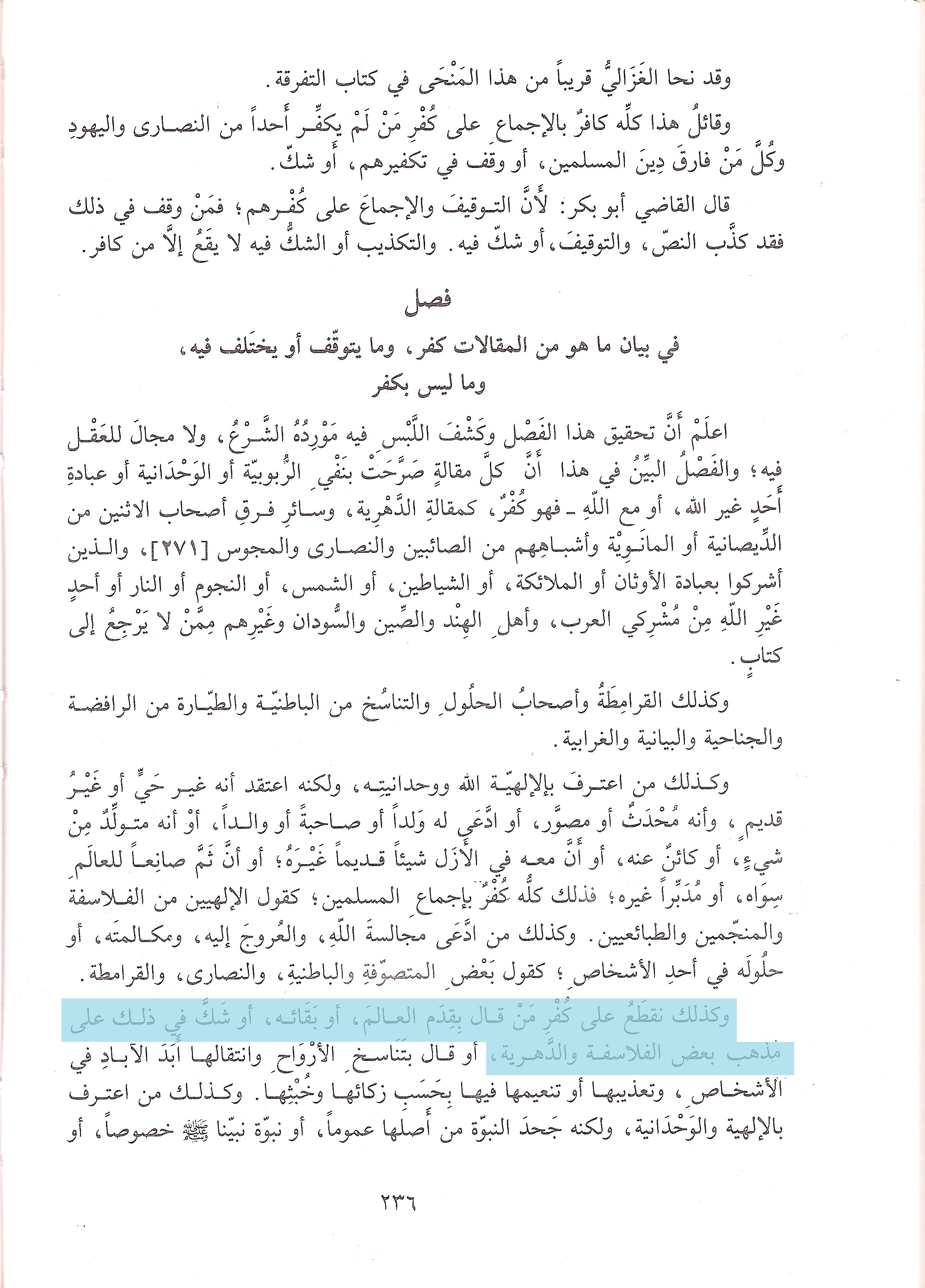 قال القاضي عياض في الشفا : « وكذلك نقطع على كفر من قال بقدم العالـم أو بقائه أو شك في ذلك على مذهب بعض الفلاسفة والدهرية » اهـ