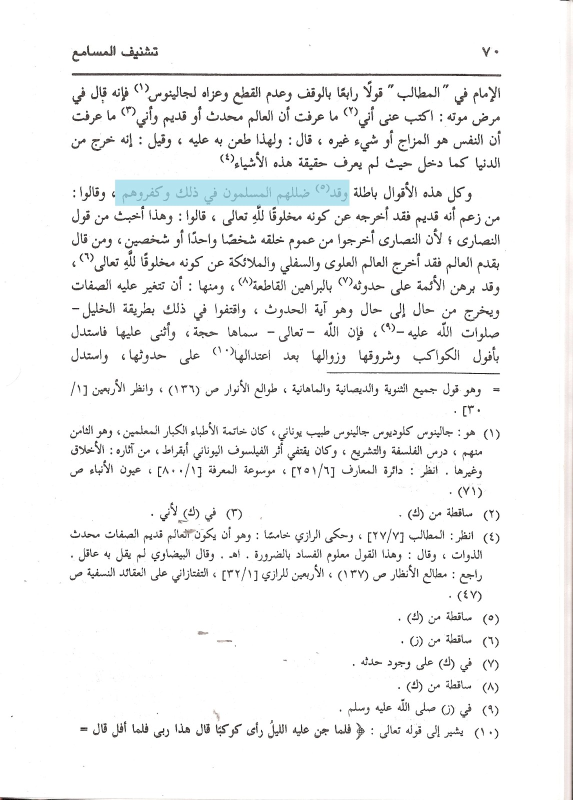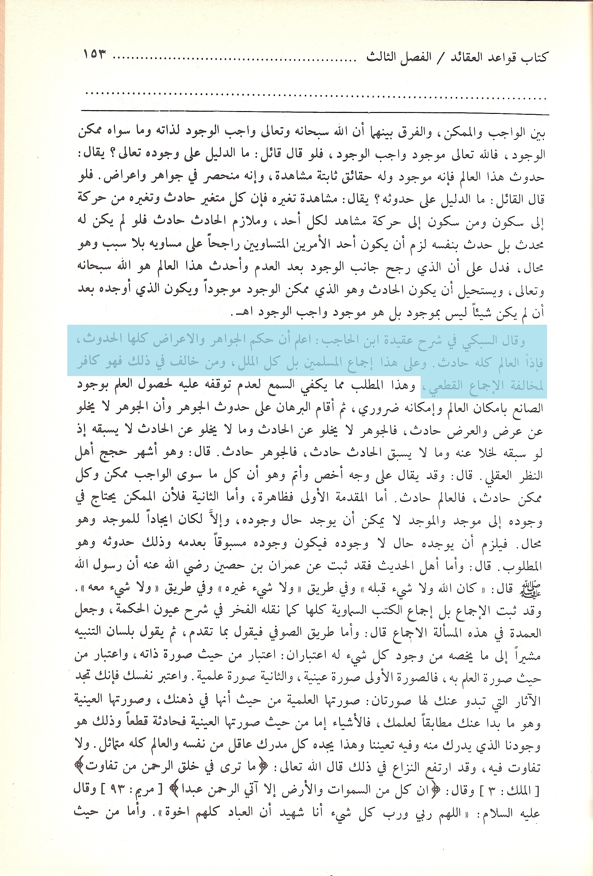 وقال في موضعءاخر منه ما نصه: « وقال السبكي في شرح عقيدة ابن الحاجب: اعلم أن حكم الجواهر والأعراض كلها الحدوث، فإذًا العالم كله حادث، وعلى هذا إجماع المسلمين بل وكل الملل، ومن خالف في ذلك فهو كافر لمخالفة الإجماع القطعي » ا.ه