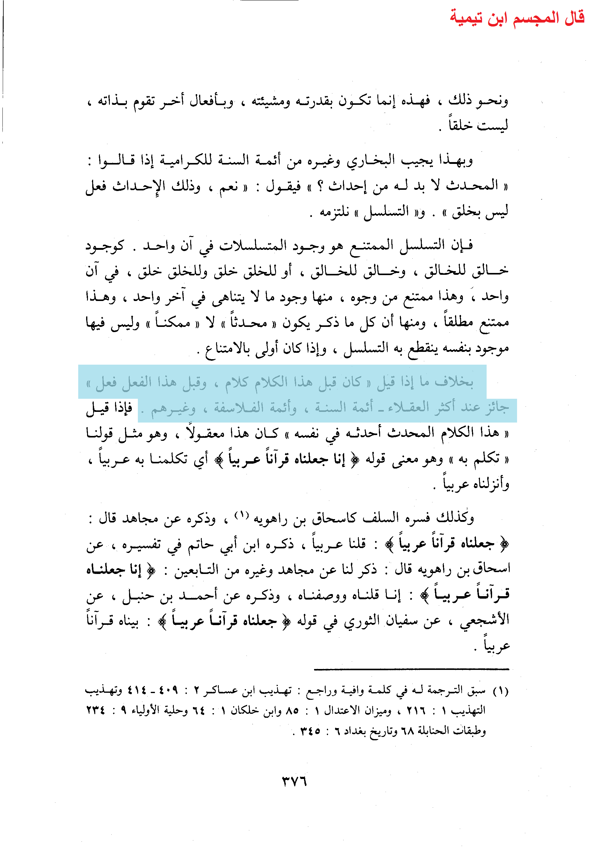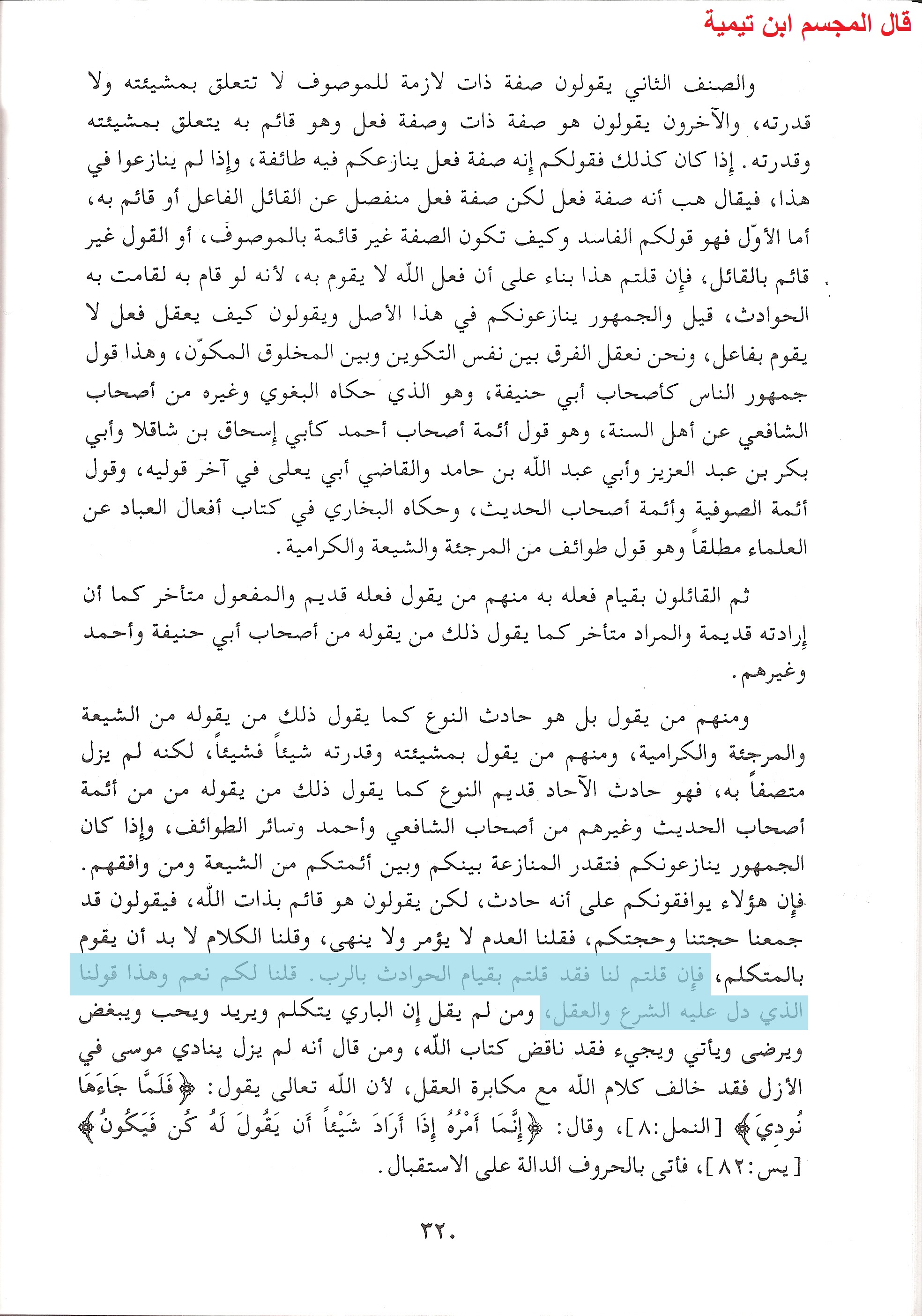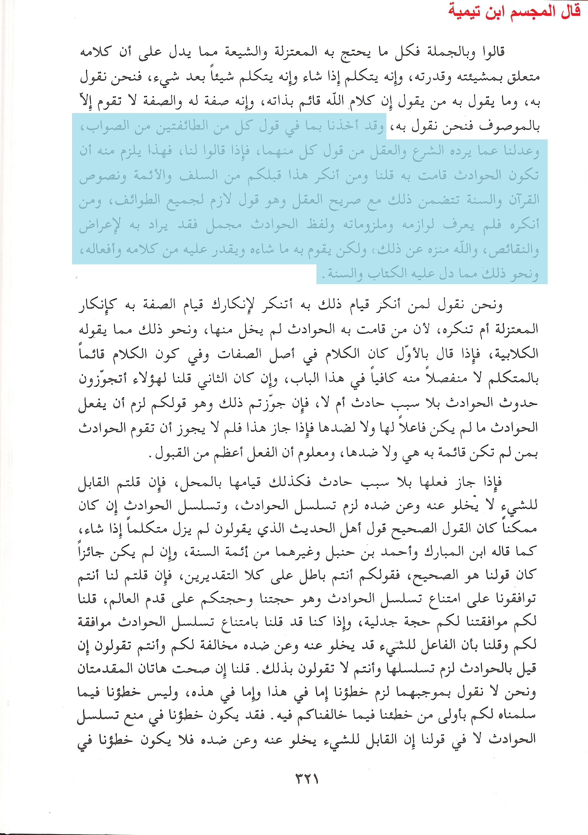 ثم قال فيه ما نصه : وقد أخذنا بما في قول كل من الطائفتين من الصواب وعدلنا عما يرده الشرع والعقل من قول كل منهما، فإذا قالوا لنا: فهذا يلزم منه أن تكون الحوادث قامت به قلنا: ومن أنكر هذا قبلكم؟ السلف الأئمة، ونصوص القرءان والسنة تتضمن ذلك مع صريح العقل وهو قول لازم لجميع الطوائف، ومن أنكره فلم يعرف لوازمه، ولفظ الحوادث مجمل فقد يراد به الأعراض والنقائص والله منزه عن ذلك، ولكن يقوم به ما شاءه ويقدر عليه من كلامه وأفعاله ونحو ذلك مما دل عليه الكتاب والسنة » اهـ