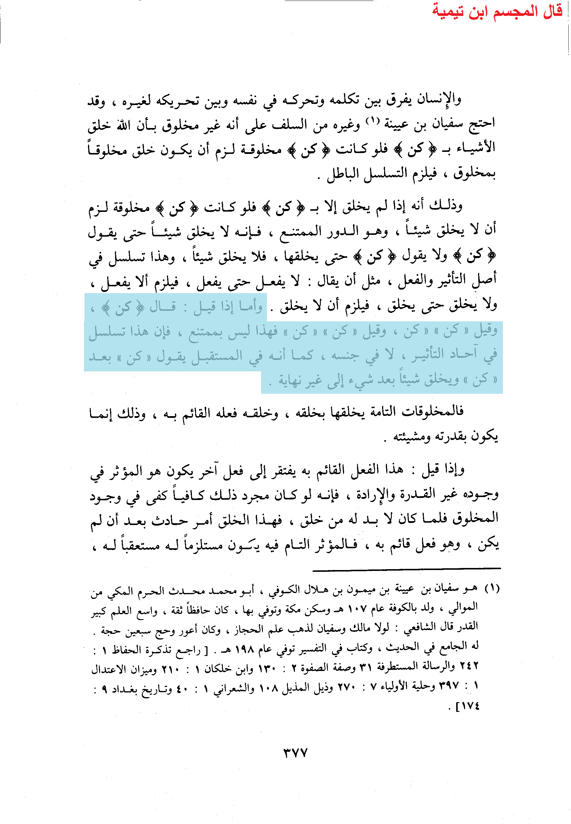 ثم قال : « وأما إذا قيل: قال « كن » وقبل « كن » « كن »، وقبل « كن » « كن »، فهذا ليس بممتنع، فإن هذا تسلسل في ءاحاد التأثير لا في جنسه، كما أنه في المستقبل يقول « كن » بعد « كن »، ويخلق شيئا بعد شىء إلى غير نهاية » اهـ