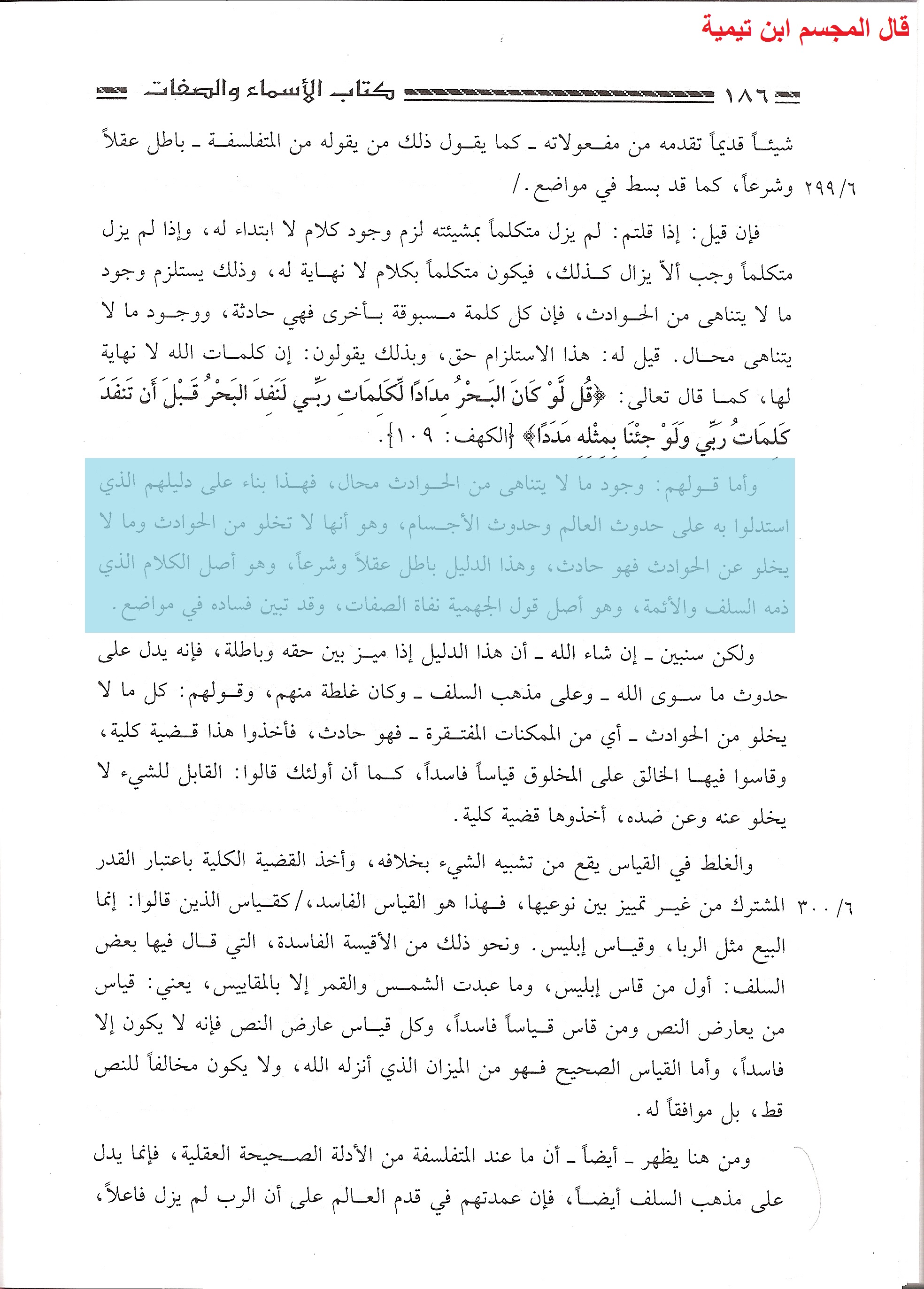 وقال أيضا في الفتاوى ما نصه : « وأما قولهم: وجود ما لا يتناهى من الحوادث محال، فهذا بناء على دليلهم الذي استدلوا به على حدوث العالم وحدوث الأجسام، وهو أنها لا تخلو من الحوادث وما لا يخلو عن الحوادث فهو حادث، وهذا الدليل باطل عقلاً وشرعًا، وهو أصل الكلام الذي ذمه السلف والأئمة، وهو أصل قول الجهمية نفاة الصفات، وقد تبين فساده في مواضع » اهـ