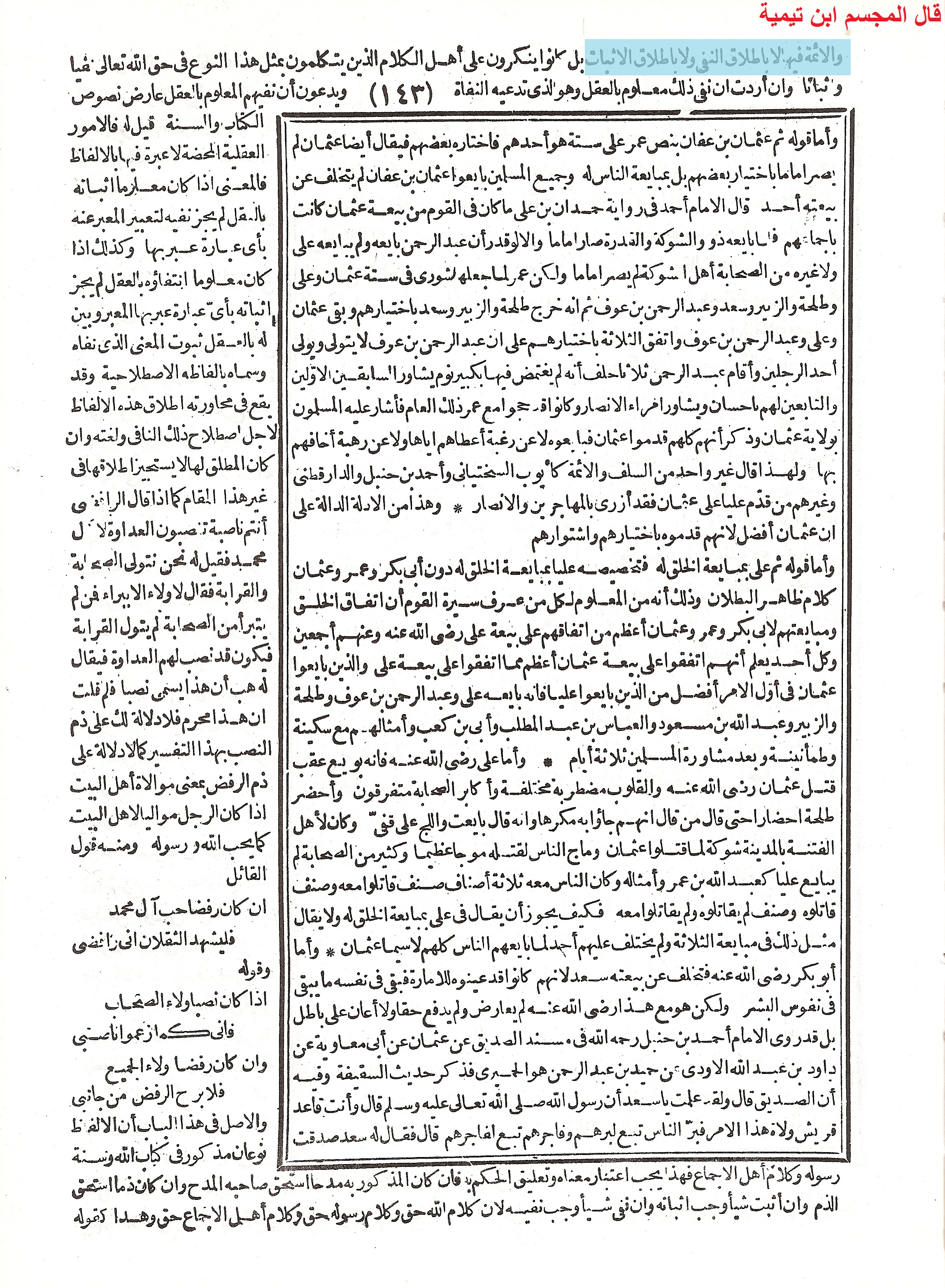 وقال في موضع ءاخر منه ما نصه : « أما الشرع فليس فيه ذكر هذه الأسماء في حق الله لا بنفي ولا إثبات، ولم ينطق أحد من سلف الأمة وأئمتها في حق الله تعالى بذلك لا نفيًا ولا إثباتًا، بل قول القائل: إن الله جسم أو ليس بجسم، أو جوهر أو ليس بجوهر، أو متحيز أو ليس بمتحيز، أو في جهة أو ليس في جهة، أو تقوم به الأعراض والحوادث أو لا تقوم به ونحو ذلك كل هذه الأقوال محدثة بين أهل الكلام المحدث لم يتكلم السلف والأئمة فيها لا بإطلاق النفي ولا بإطلاق الإثبات » اهـ