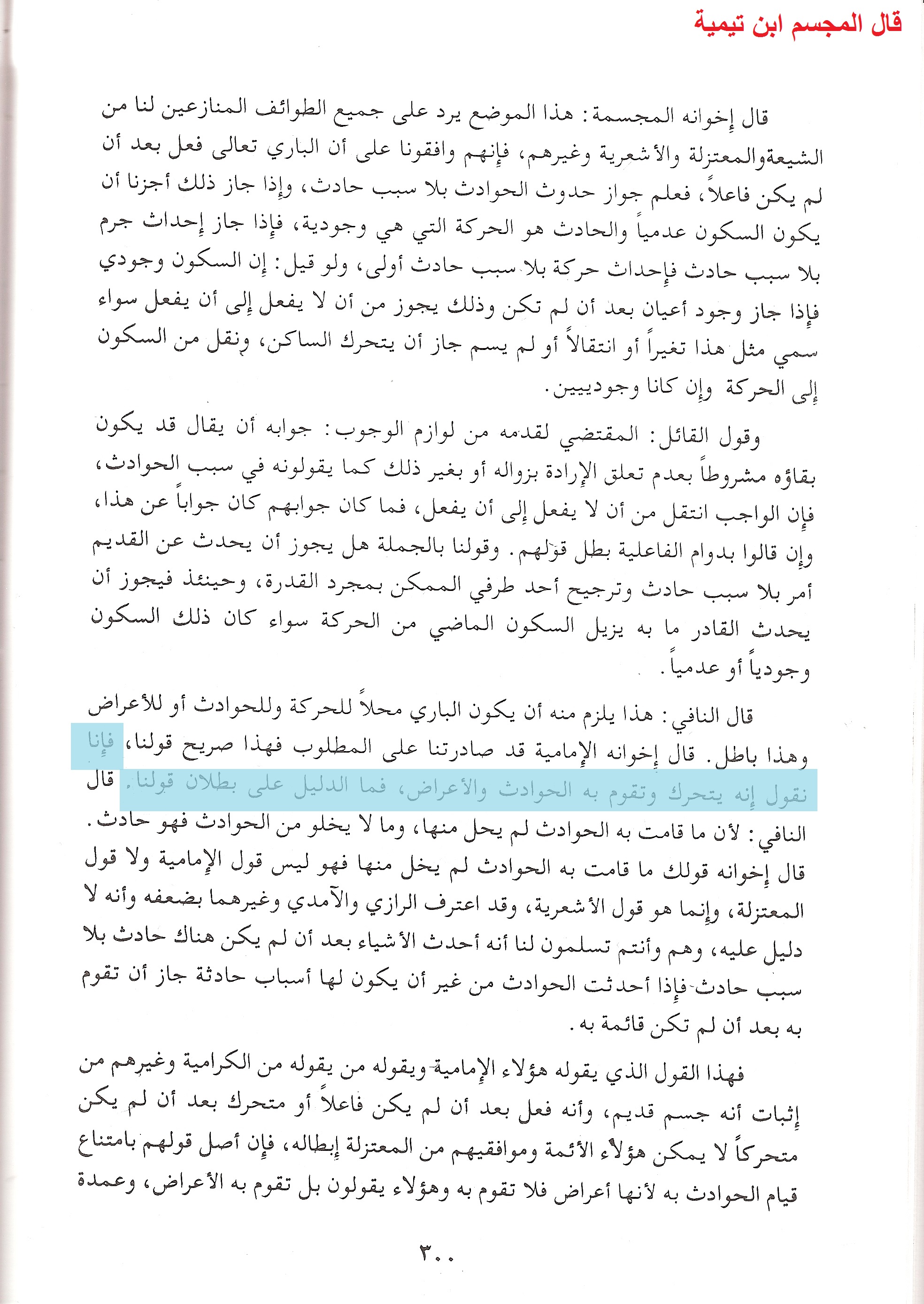 وقال في المنهاج ما نصه: : » فإنا نقول إنه يتحرك وتقوم به الحوادث والأعراض فما الدليل على بطلان قولنا؟ اهـ