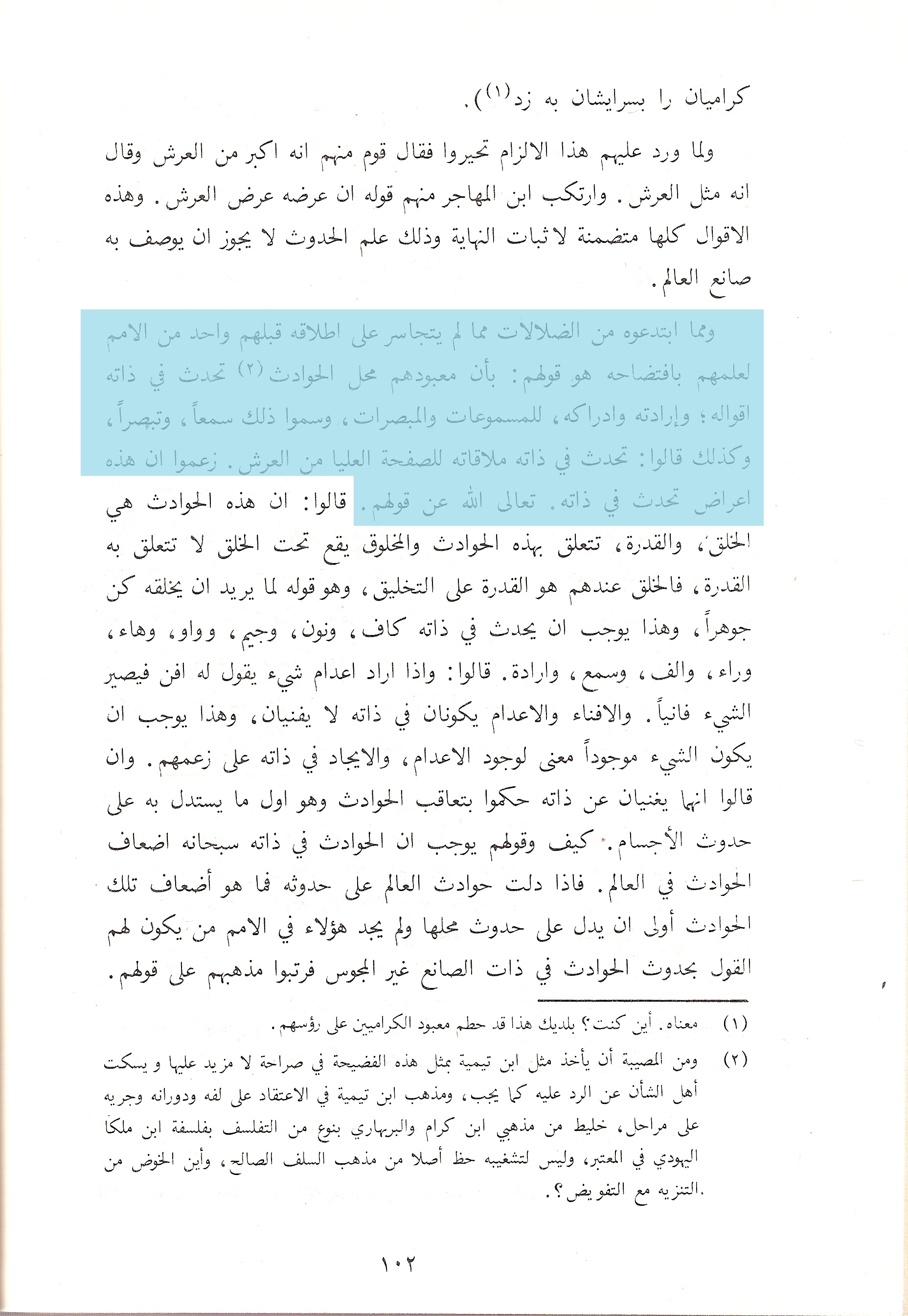 قال في التفسير ما نصه : « ومن قال: إن الخلق حادث كالهشامية والكرّامية قال: نحن نقول بقيام الحوادث به، ولا دليل على بطلان ذلك، بل العقل والنقل والكتاب والسنة واجماع السلف يدل على تحقيق ذلك، كما قد بسط في موضعه. ولا يمكن القول بأن الله يدير هذا العالم إلا بذلك، كما اعترف بذلك أقرب الفلاسفة إلى الحق كأبي البركات صاحب » المعتبر » وغيره » اهـ
