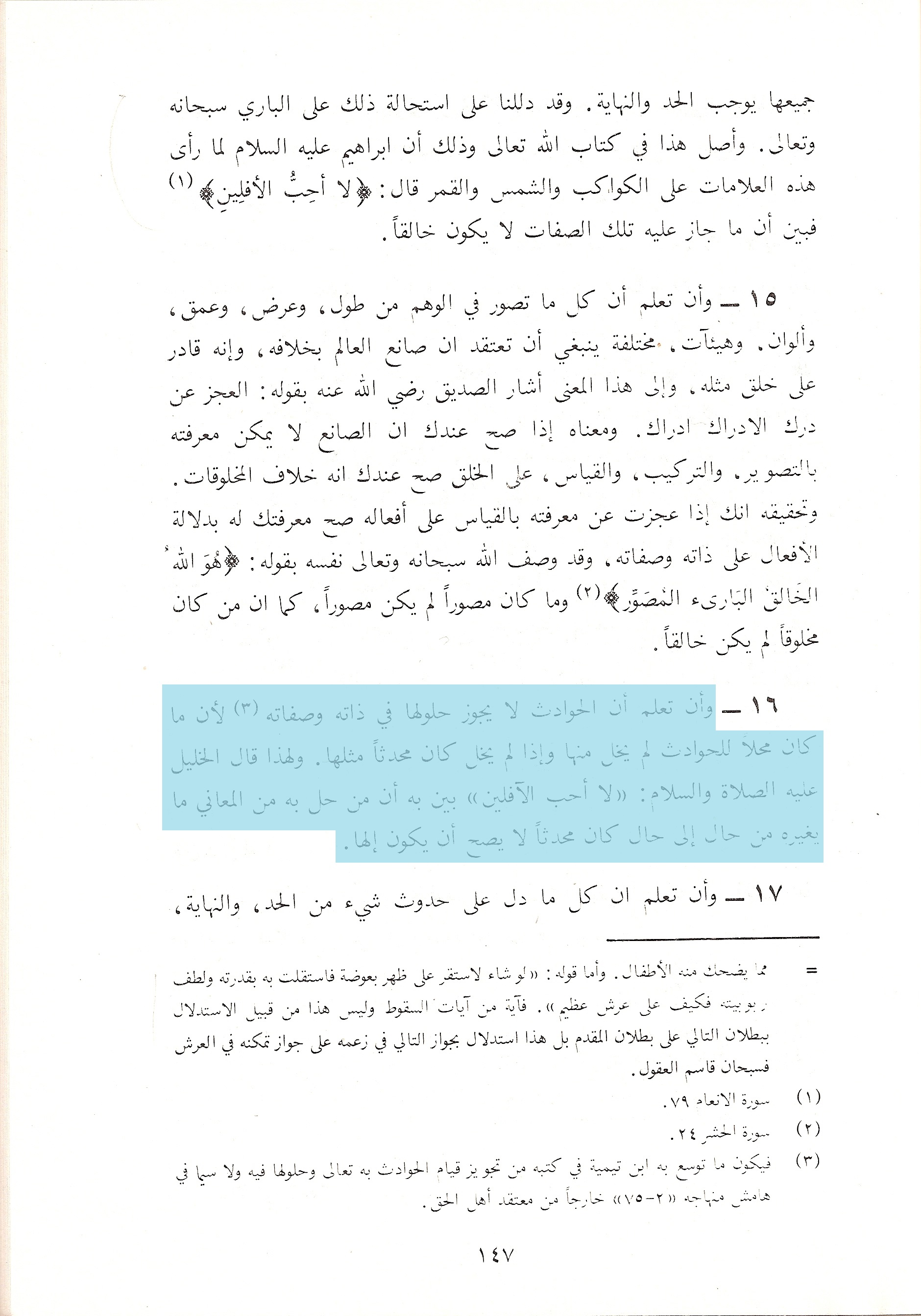 فائدة: قال سيف الدين الآمدي في كتاب غاية المرام في علم الكلام ما نصه: « فالرأي الحق والسبيل الصدق والأقرب إلى التحقيق أن يقال: لو جاز قيام الحوادث به لم يخل عند اتصافه بها إما أن توجب له نقصًا أو كمالا أو لا نقص ولا كمال، لا جائر أن يقال بكونها غيرَ موجبة للكمال ولا النقصان فان وجود الشىء بالنسبة إلى نفسه أشرف له من عدمه، فما اتصف بوجود الشىء له وهو مما لا يوجب فوات الموصوف ولا فوات كمال له، وبالجملة لا يوجب له نقصًا فلا محالة أن اتصافه بوجود ذلك الوصف له أولى من اتصافه بعدمه لضرورة كون العدم في نفسه مشروفا بالنسبة إلى مقابله من الوجود، والوجود أشرف منه، وما اتصف بأشرف الأمرين من غير أن يوجب له في ذاته نقصًا تكون نسبة الوجود إليه مما يرجع إلى النقص والكمال على نحو نسبة مقابله من العدم، ولا محالة من كانت نسبته إلى ذلك وجود ذلك الوصف أشرف منه بالنسبة إلى عدمه، ولا جائز أن يقال : إنها موجبة لكماله، وإلا لوجب قدمها لضرورة أن لا يكون البارىء ناقصًا محتاجًا إلى ناحية كمال في حال عدمها، فبقي أن يكون اتصافه بها مما يوجب القول بنقصه بالنسبة إلى حاله قبل أن يتصف بها، وبالنسبة إلى ما لم يتصف بها من الموجودات، ومحال أن يكون الخالق مشروفًا أو ناقضا بالنسبة إلى المخلوق، ولا من جهة ما كما مضى » ا.هـ
