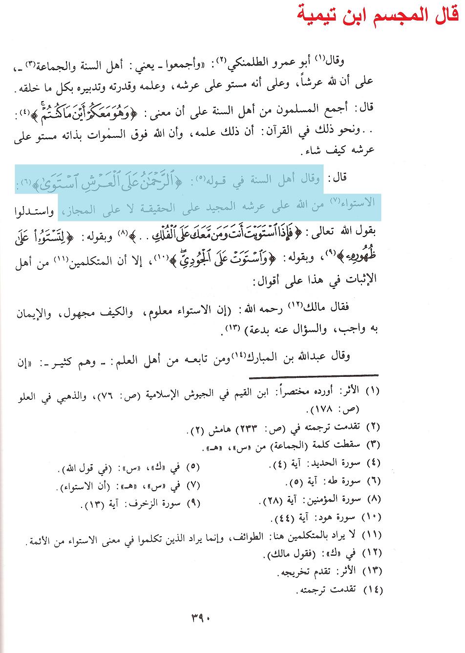 وقال فيه ايضا وفي فتاويه ما نصه: » وقال أهل السنة في قوله: (( الرَّحمَنُ علَى العَرْشِ استَوَى)) : الاستواء من الله على عرشه المجيد على الحقيقة لا على المجاز » اهـ