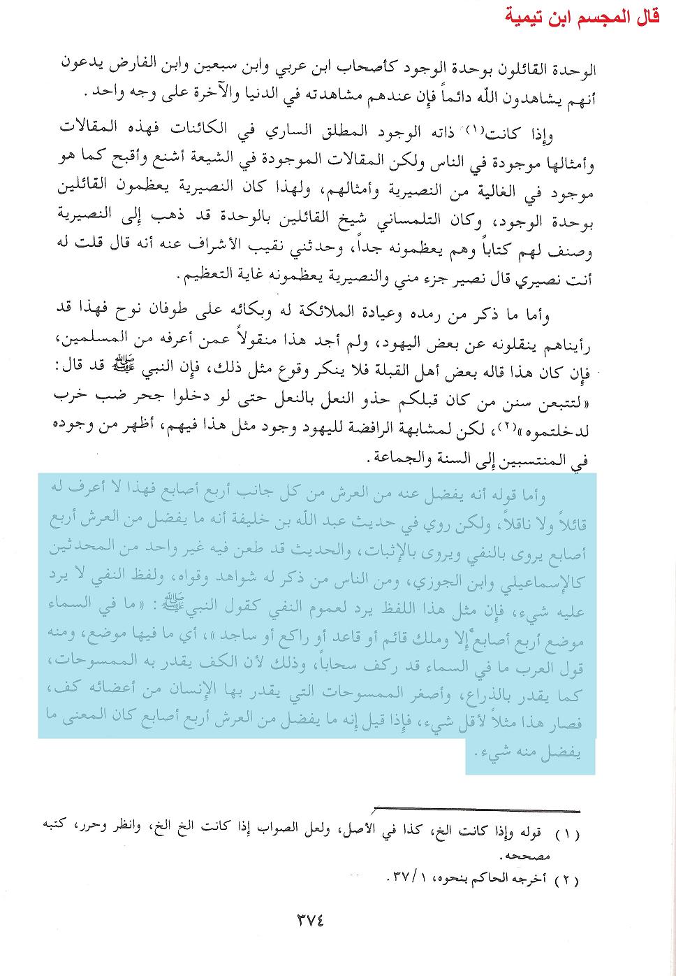 ثم قال ما نصه: » ومن قال: » ما يفضل إل مقدار أربع أصابع » فما فهموا هذا المعنى، فظنوا أنه استثنى، فاستثنوا، فغلطوا. وإنما هو توكيد للنفي وتحقيق للنفي العام. وإلا فأي حكمة في كون العرش يبقى منه قدر أربع أصابع خالية، وتلك الأصابع أصابع من الناس، والمفهوم من هذا أصابع الإنسان. فما بال هذا القدر اليسير لم يستو الرب عليه » اهـ