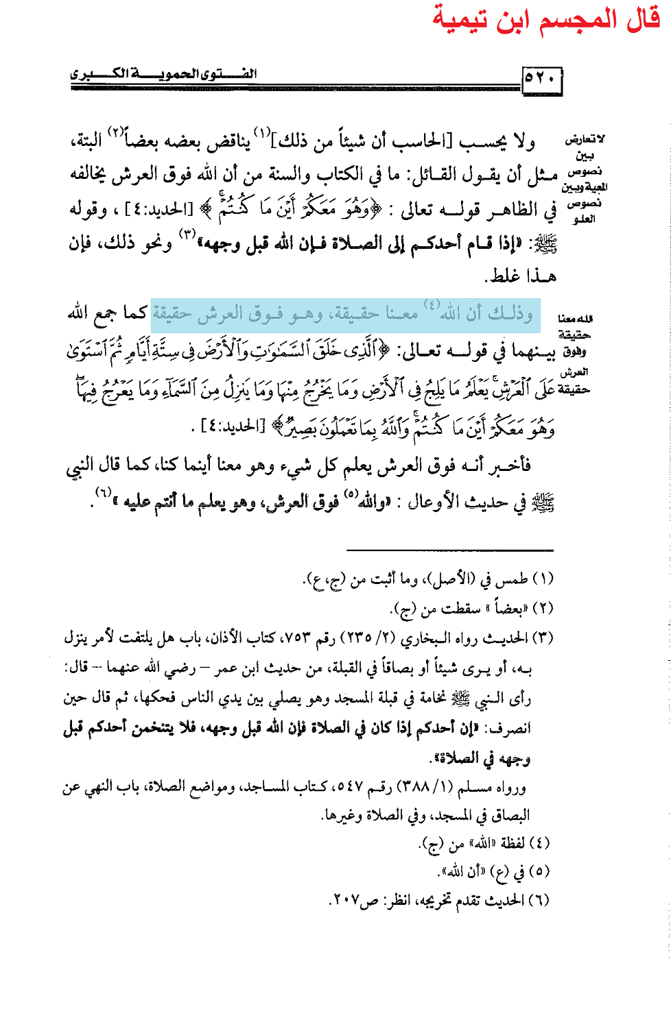 ويقول في الفتوى الحموية بعد كلام ما نصه: » وذلك أن الله معنا حقيقة، وهو فوق العرش حقبقة » اهـ