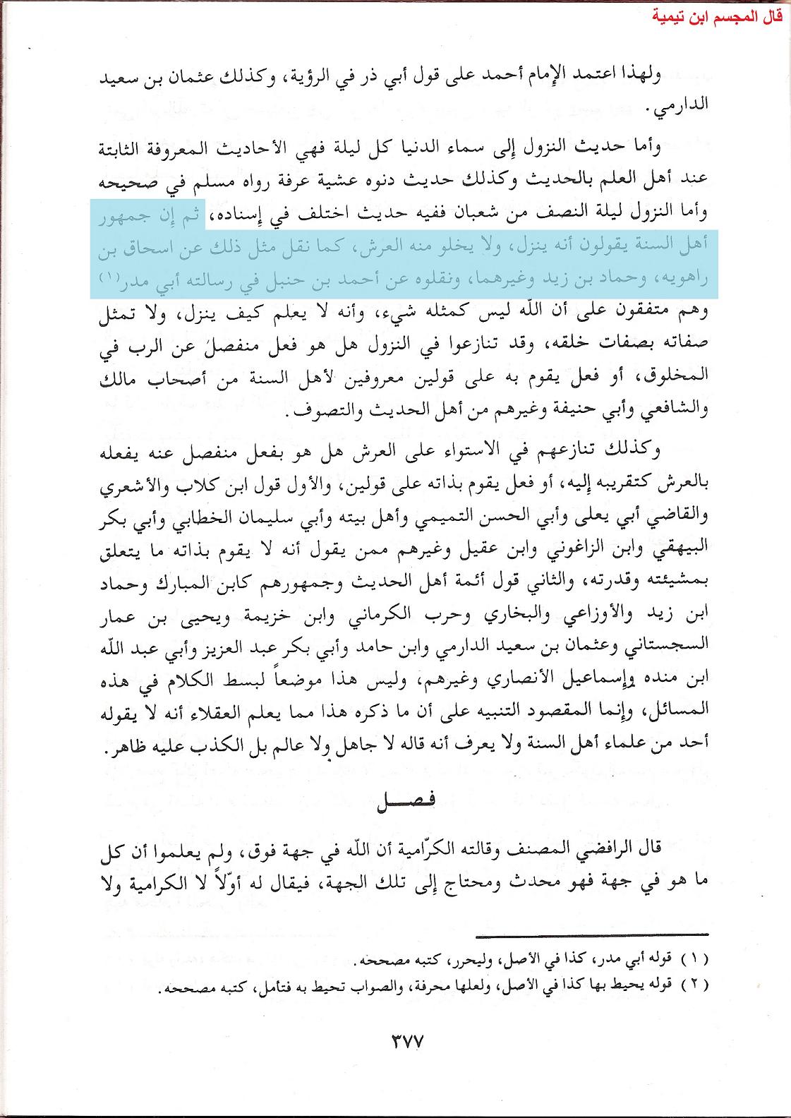 ونقل ابن تيمية وأمثاله لا ينفع في العقائد لأنه لا يحتج في إثبات صفة لله إلا بنص الكتاب والسنة المتفق على صحتها السالم رواتها عن الضعيف, فلا يحتج في ذلك بالحديث إذا كان في رواته من هو مختلف فيه, فلا تثبت صفة بقول صحابي ولو صح الإسناد إليه, وما يروى عن التابعي أولى بعدم الاحتجاج به
