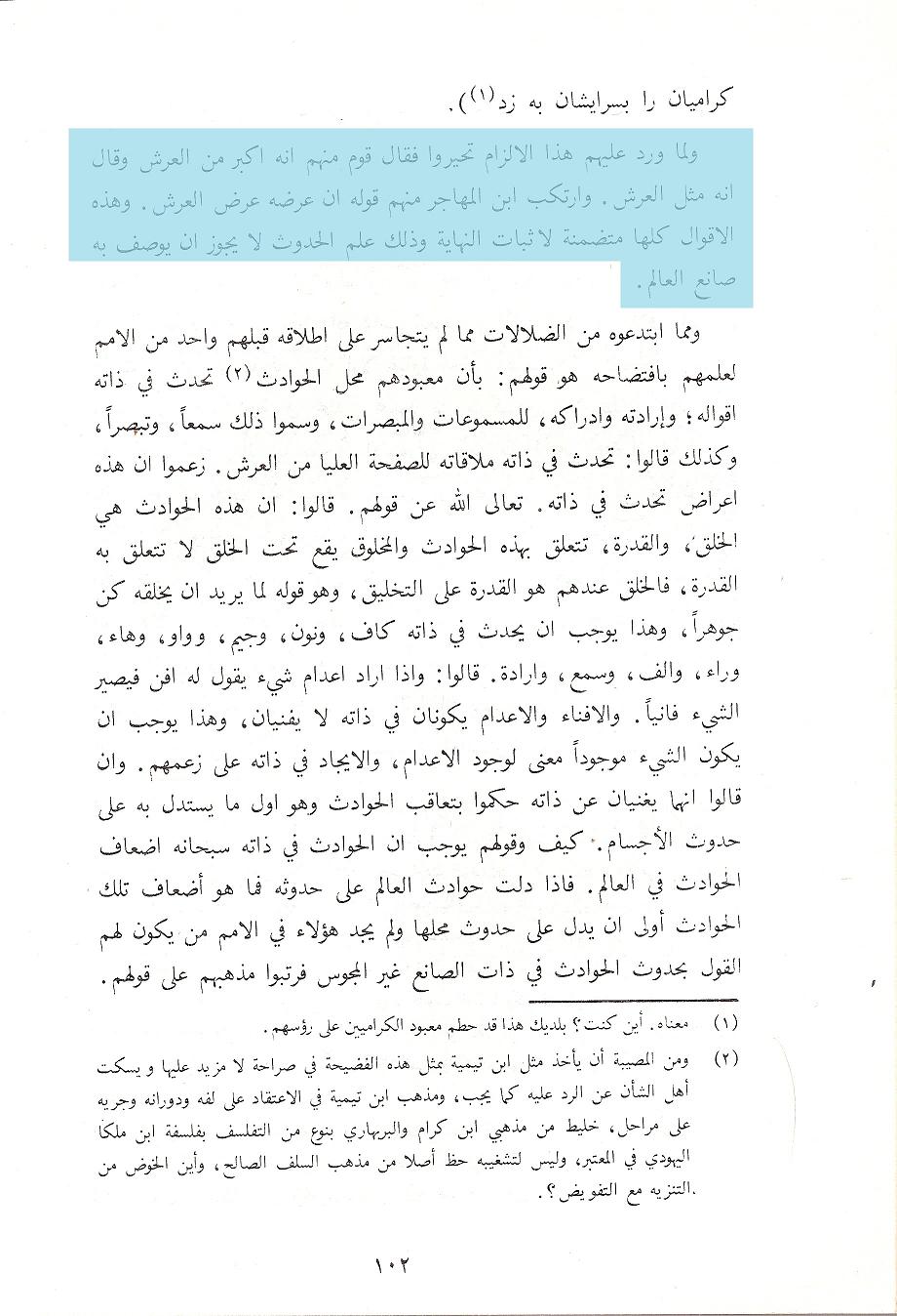 ويبطله أيضًا قول الإمام الحجة أبي المظفر الاسفراييني في رده على شُبة الكرامية ونصه: » ولما ورد عليهم هذا الإلزام تحيروا فقال قوم منهم: إنه أكبر من العرش, وقال قوم إنه مثل العرش, وارتكب ابن المهاجر منهم قوله: إن عرضه عرض العرش, وهذه الأقوال كلها متضمنة لإثبات النهاية, وذلك عَلَمُ الحدوث لا يجوز أن يوصف به صانع العالم » اهـ