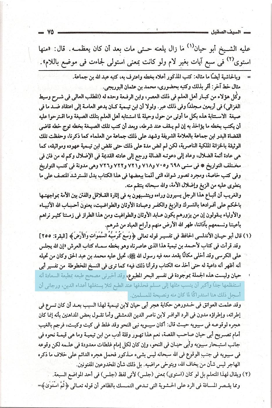ونقل أبي حيان هذا كان قد خذف من النسخة المطبوعة القديمة، ولكن النسخة الخطية تثبته، وسبب حذفه من النسخة المطبوعة ما قاله الزاهد الكوثري في تعليقه على السيف الصقيل ، قال : » وقد أخبرني مصحح طبعه بمطبعة السعادة أنه استفظعها جداً فحذفها عند الطبع لئلا يستغلها أعداء الدين، ورجاني أن أسجل ذلك هنا استدراكاً لما كان منه ونصيحة للمسلمين » اهـ
