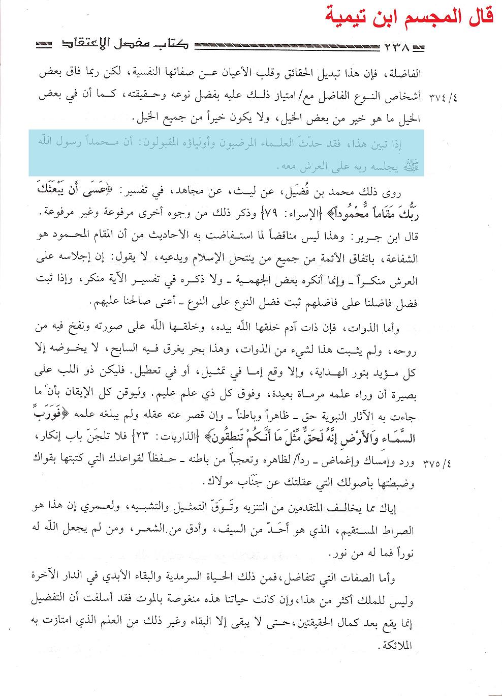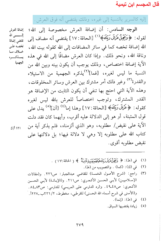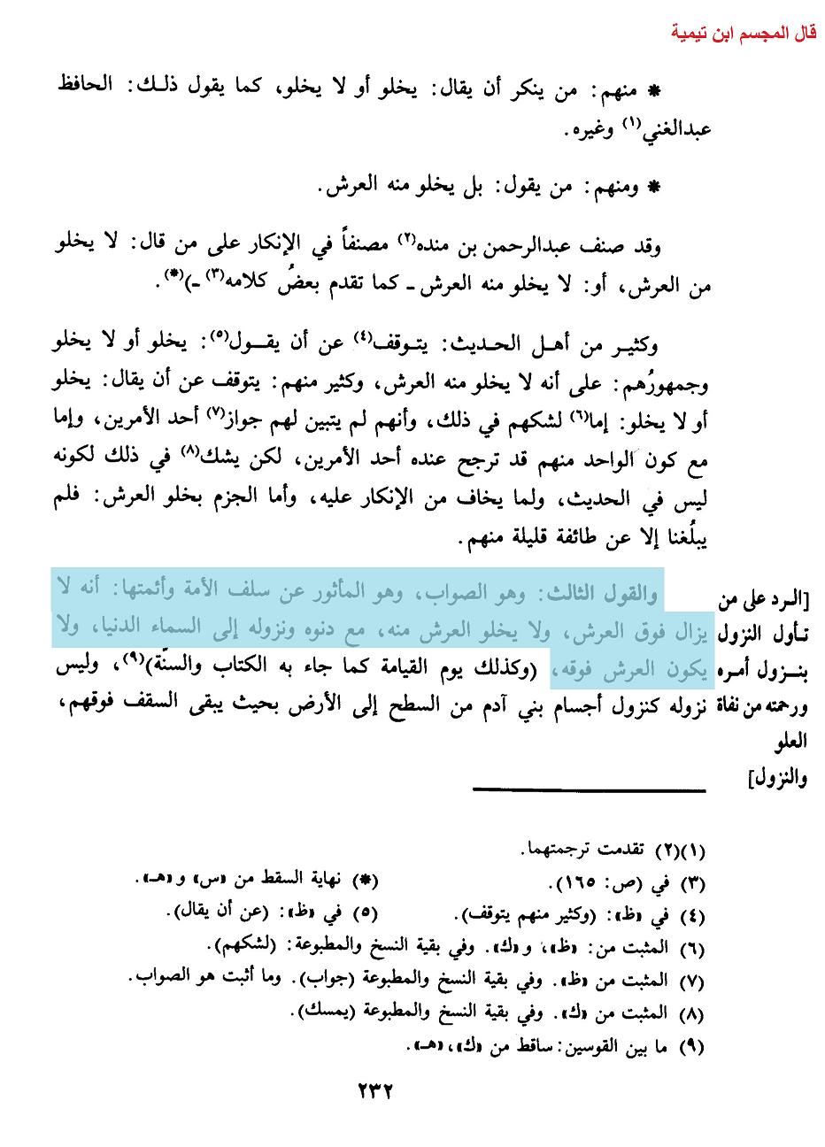 فلينظر العقلاء إلى تخبط ابن تيمية حيث يقول مرة إنه جالس على العرش، ومرة إنه جالس على الكرسي، وقد ثبت في الحديث أن الكرسي بالنسبة للعرش كحلقة في أرض فلاة فكيف ساغ عقله