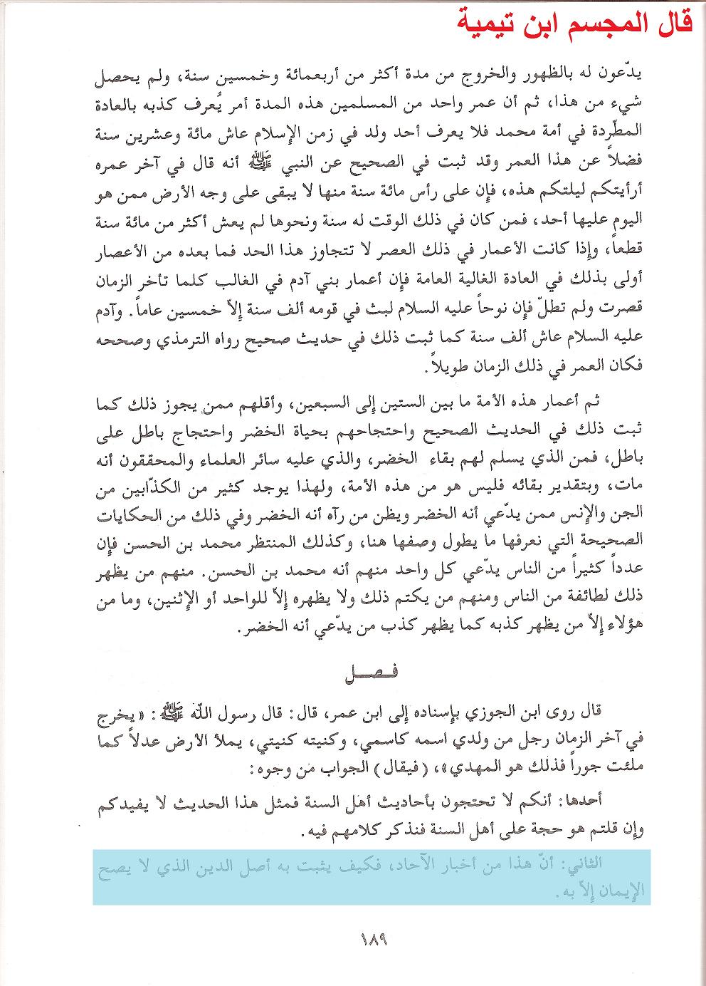 وقد ناقض ابن تيمية نفسه فيذكر في منهاجه عن حديث المهدي ما نصه: » الثاني : أن هذا من أخبار الآحاد ، فكيف يثبت به أصل الدين الذي لا يصح الإيمان إلا به » اهـ