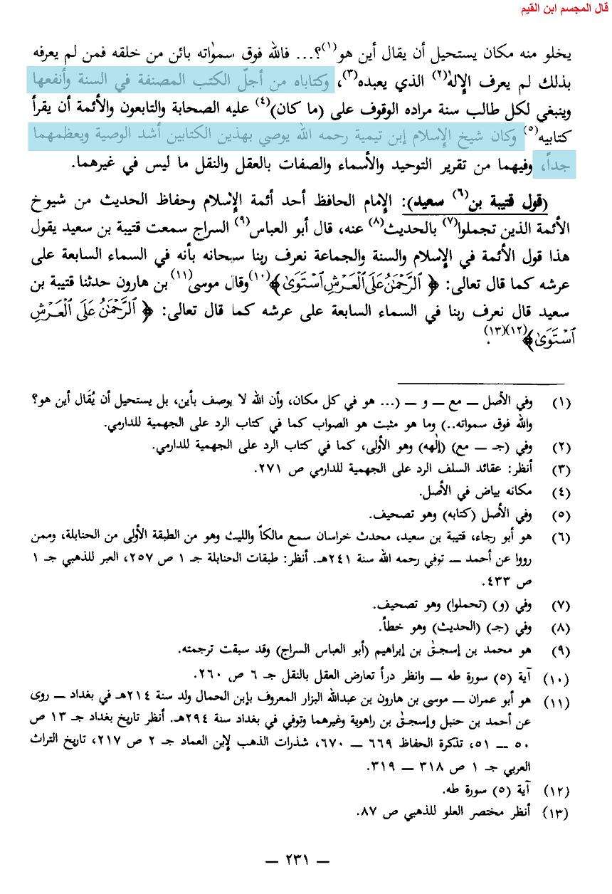 وقال أيضا فيهما ما نصه : » واذا كان قعود الميت في قبره ليس هو مثل قعود البدن، فما جاءت به الآثار عن النبي صلى الله عليه وسلم من لفظ القعود والجلوس في حق الله تعالى كحديث جعفر بن أبي طالب رضي الله عنه وحديث عمر بن الخطاب رضي الله عنه وغيرهما أولى أن لا يماثل صفات أجسام العباد » اهـ