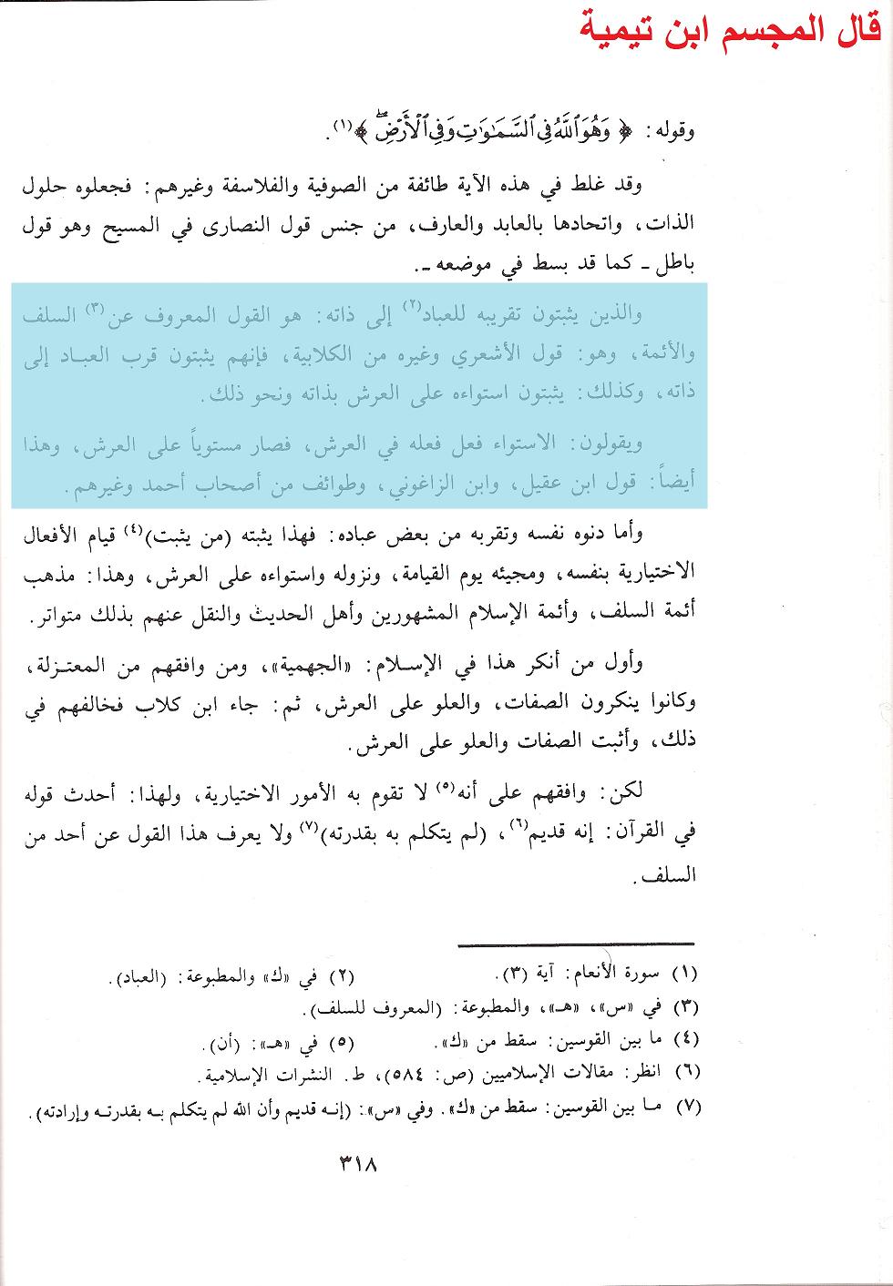 وقال فيه ايضًا ما نصه: » والذين يثبتون تقريبه العباد الى ذاته هو القول المعروف للسلف والائمة، وهو قول الاشعري وغيره من الكلابية، فإنهم يثبتون قرب العباد الى ذاته، وكذلك يثبتون استواءه على العرش بذاته ونحو ذلك، ويقولون: الاستواء فعل فعله في العرش فصار مستويا على العرش ، وهذا أيضا قوا ابن عقيل وابن الزاغوني وطوائف من أصحاب أحمد وغيرهم » أهـ