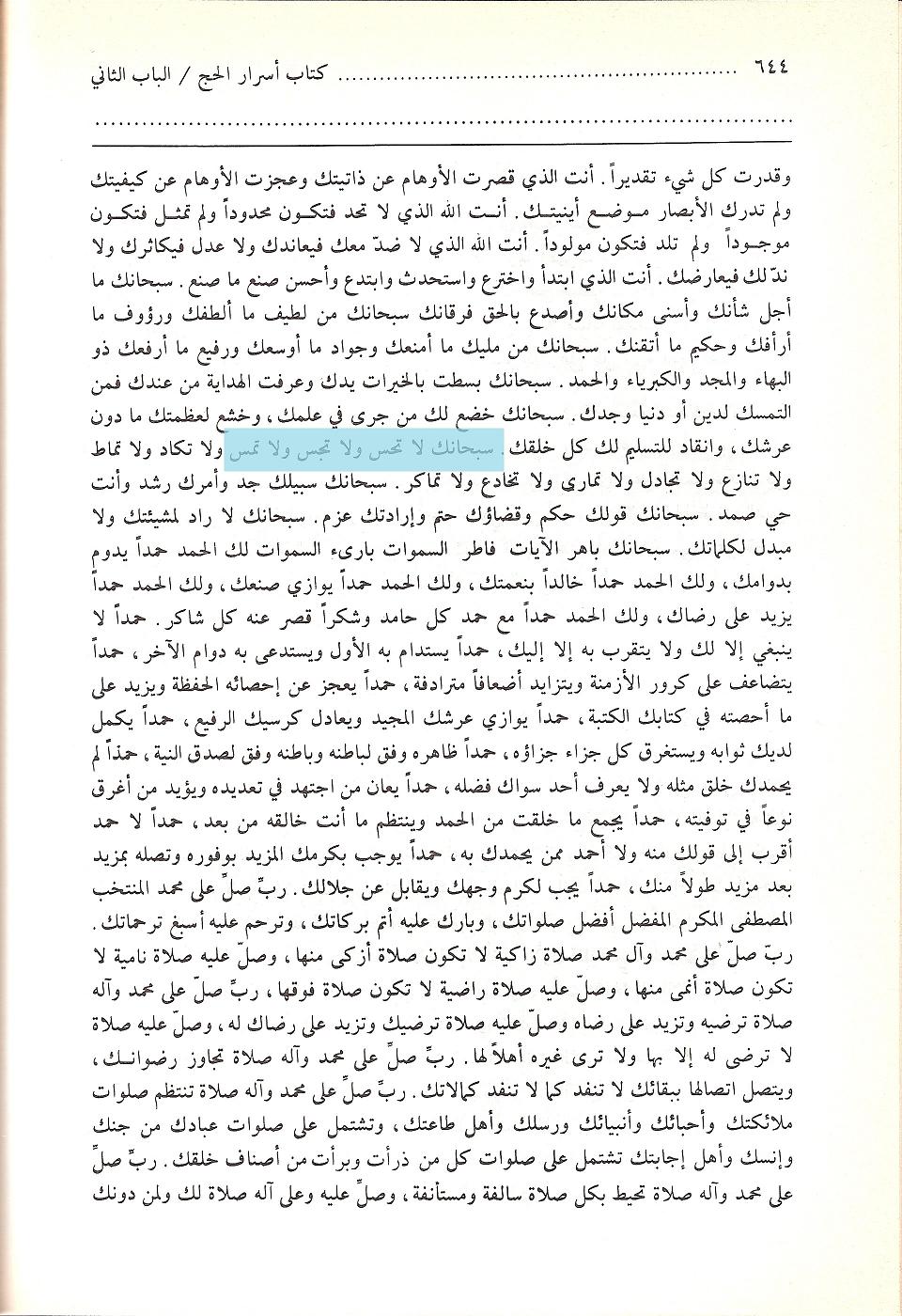 ويبطل قوله هذا كلام الإمام علي بن الحسين زين العابدين: سبحانك لا تُحَسُّ ولا تُمسُّ ولا تُجسُّ