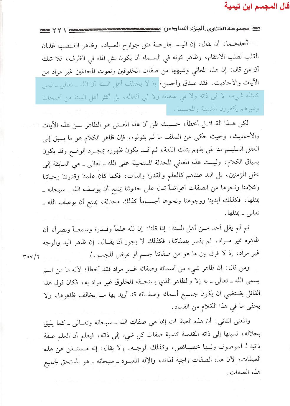 « De fait, Ahlou s-Sounnah ne diverge pas sur le fait que Allah ta’ala, rien n’est tel que Lui, ni du point de vue de Son être, ni de Ses attributs, ni de Ses actes, bien plus, la plupart des gens de Ahlous-Sounnah, qu’ils soient de nos compagnons ou autres, déclarent mécréants les mouchabbihah et les moujassimah. »