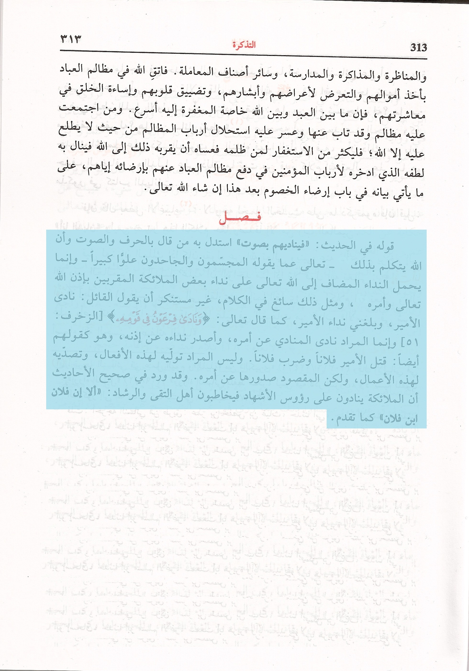 قال القرطبي في التذكرة ما نصه : فصل: قوله في الحديث: « فيناديهم بصوت »: استدل به من قال بالحرف والصوت وأن الله يتكلم بذلك، تعالى عما يقول المجسمون والجاحدون علوًا كبيرًا، إنما يُحمل النداء المضاف إلى الله تعالى على نداء بعض الملائكة المقربين بإذن الله تعالى وأمره، ومثل ذلك سائغ في الكلام غير مستنكر أن يقول القائل: نادى الأمير، وبلغني نداء الأمير، كما قال تعالى: (وَنَادَى فِرْعَونُ فِي قَوْمِهِ) (سورة الزخرف/51)، وإنما المراد نادى المنادي عن أمره، وأصدر نداءه عن إذنه، وهو كقولهم أيضًا قتل الأمير فلانًا، وضرب فلانًا، وليس المراد توليَه لهذه الأفعال وتصديَهُ لهذه الأعمال، ولكن المقصود صدورها عن أمره. وقد ورد في صحيح الأحاديث أن الملائكة ينادون على رؤوس الأشهاد فيخاطبون أهل التقى والرشاد: ألا إن فلان ابن فلان كما تقدم